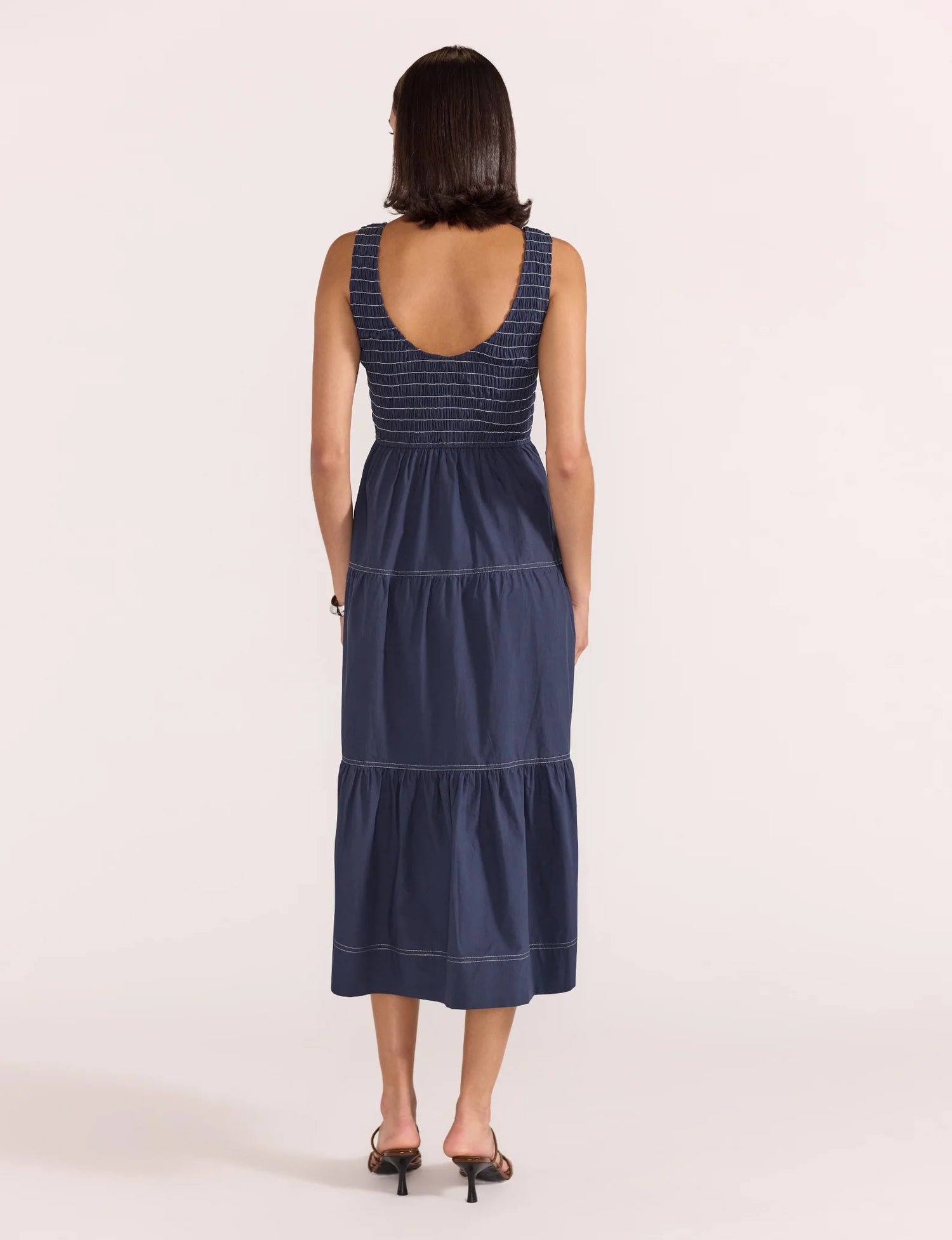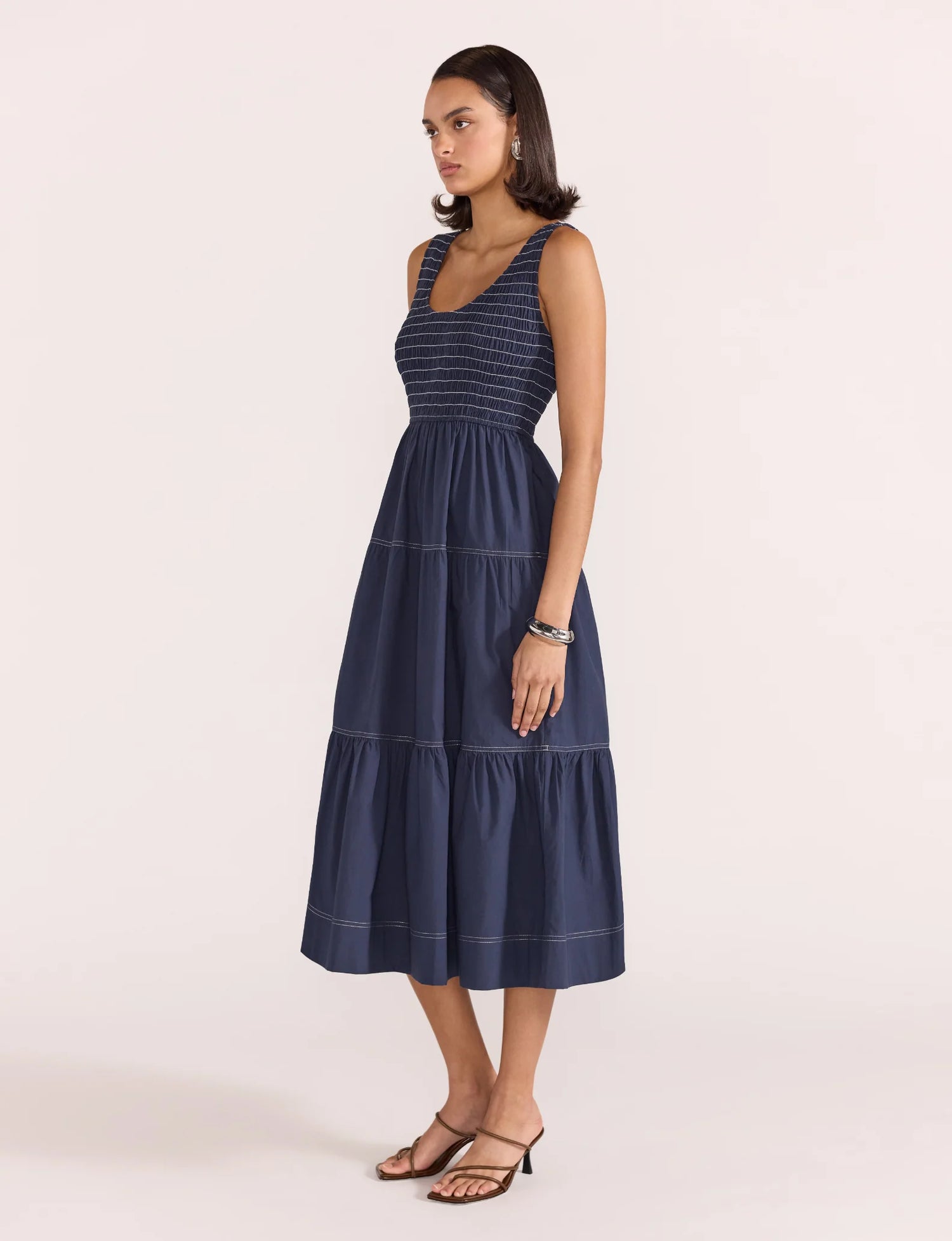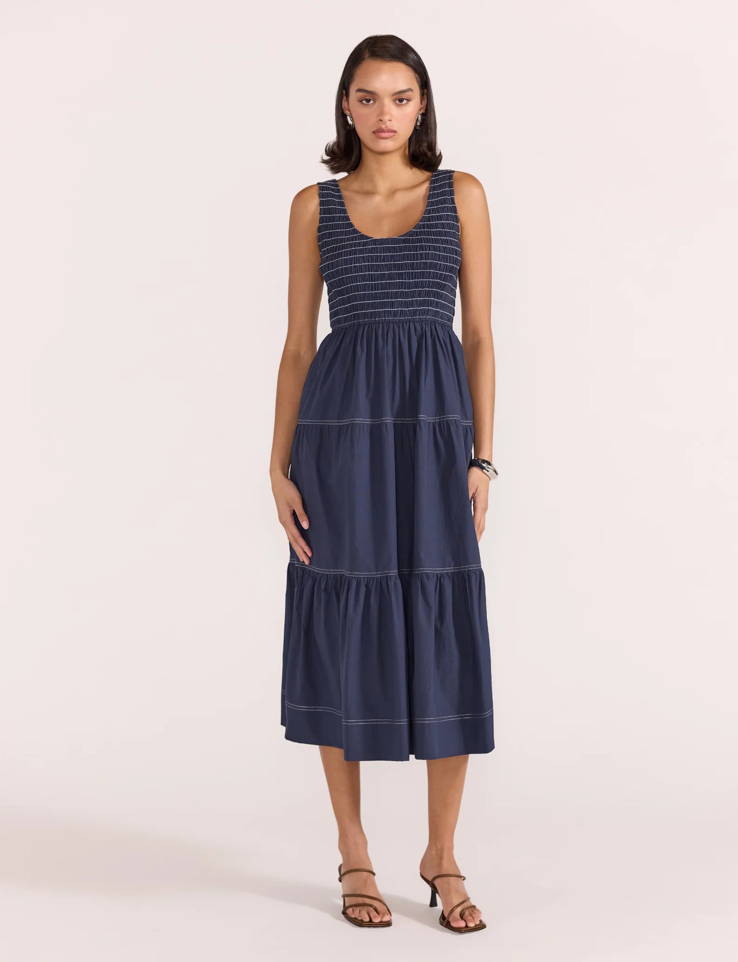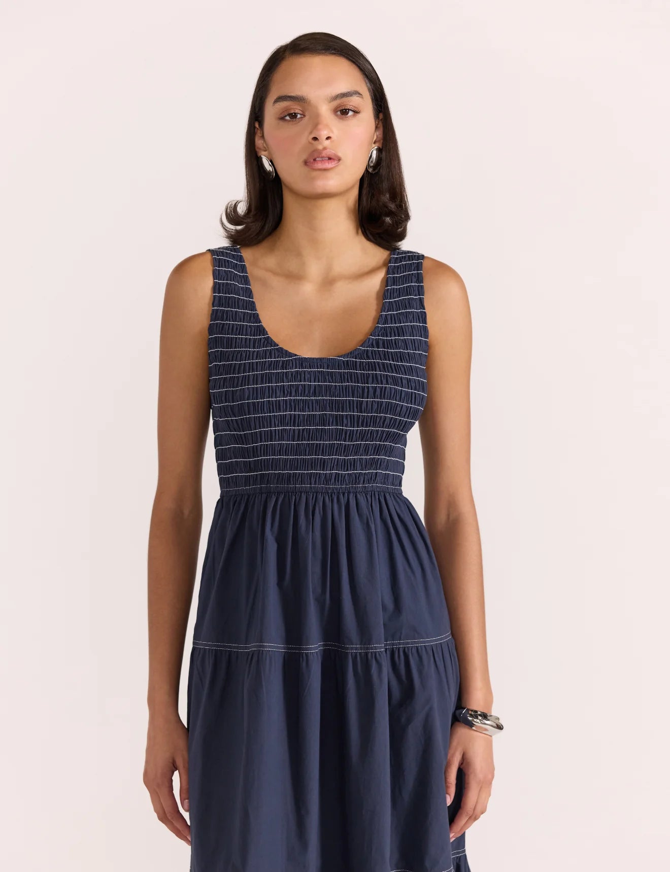 Perfect for any occasion, this dress offers a flattering fit with comfortable shirring and wide bra-friendly straps. Dress it down with slides or dress it up with mules and layered jewelry. Available in classic navy for a timeless look.