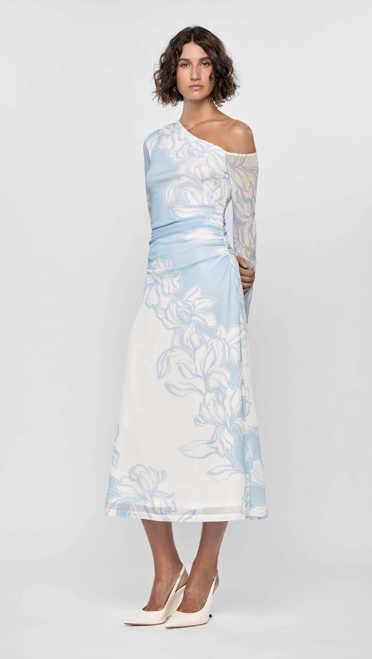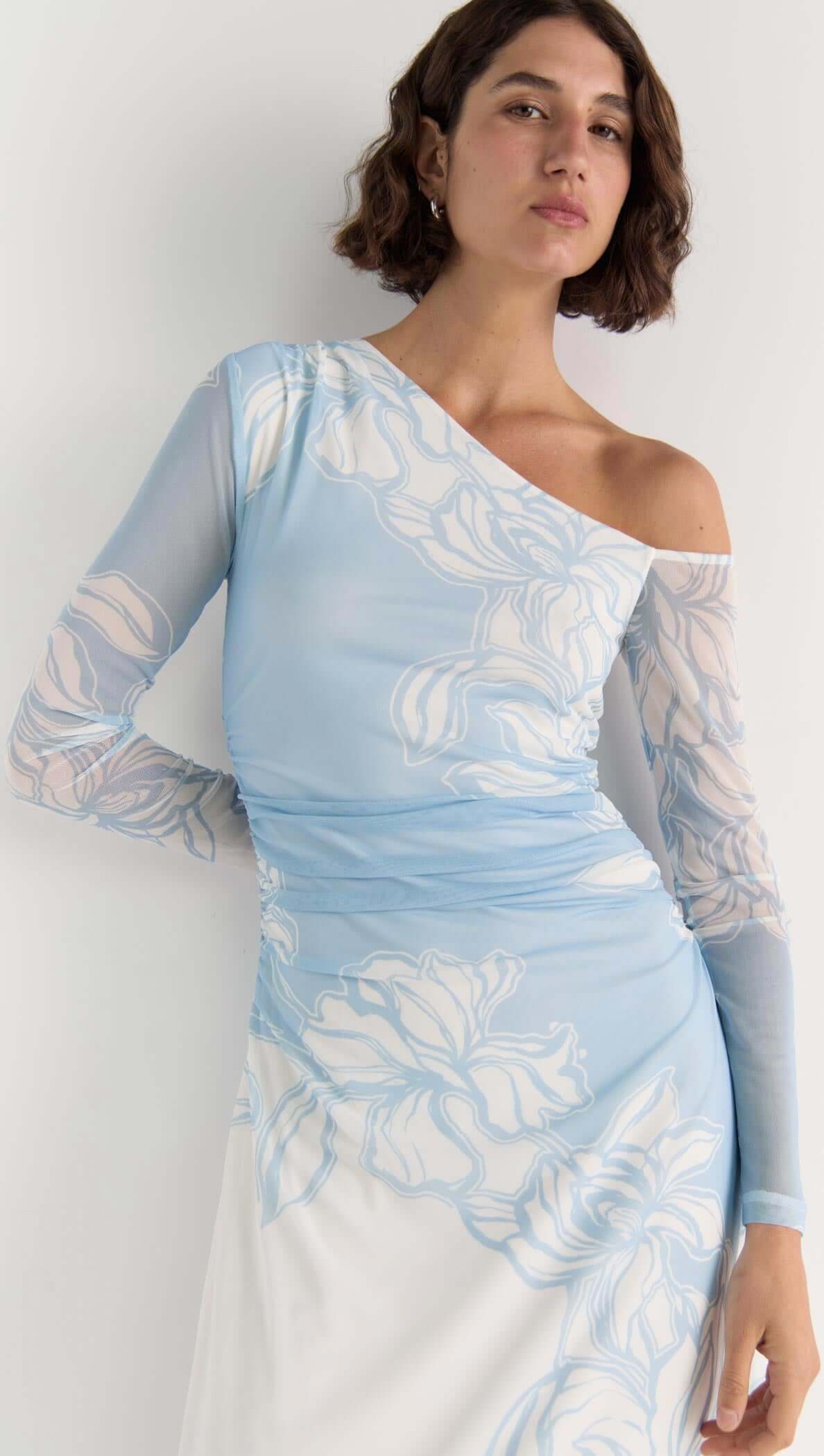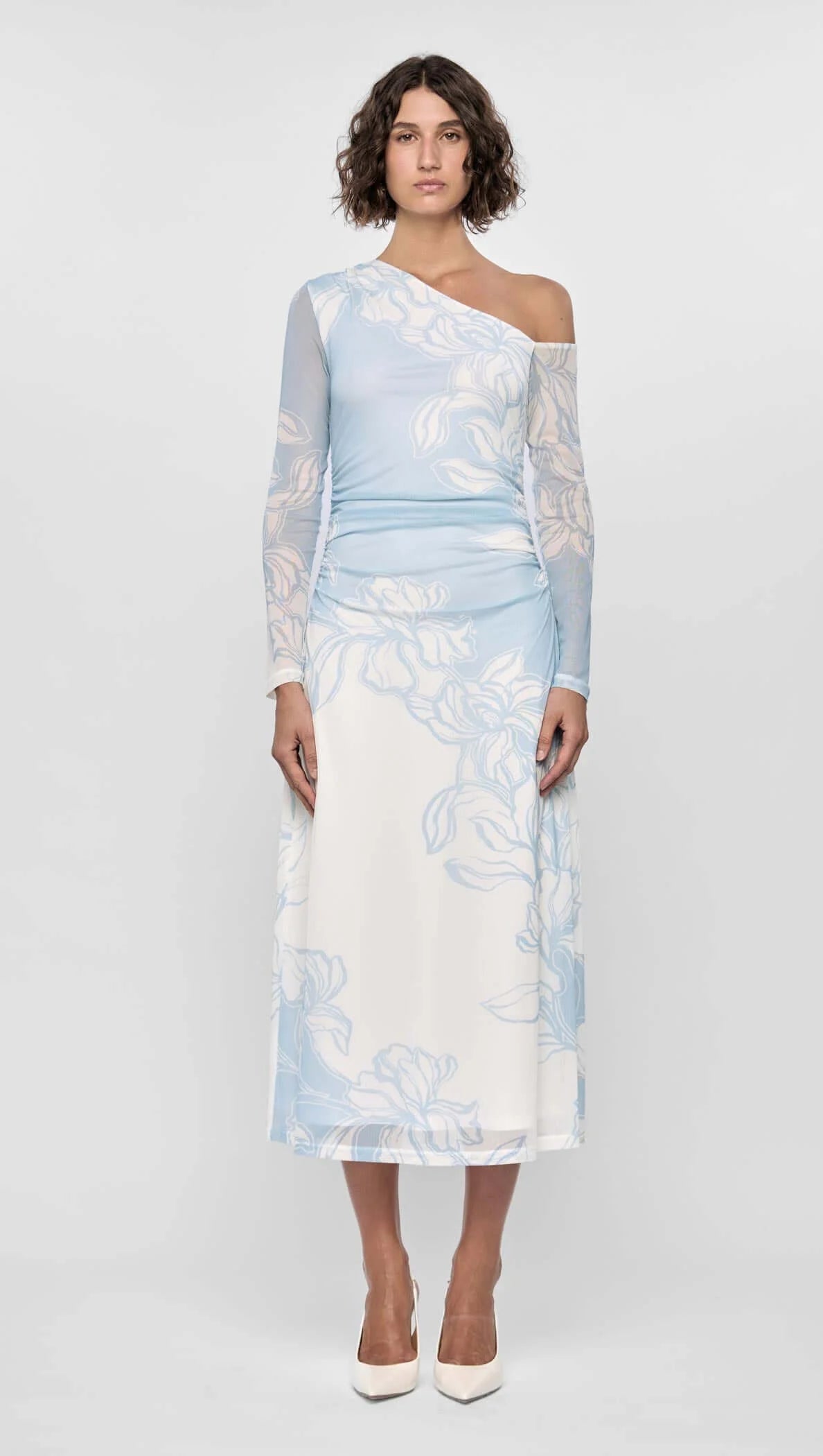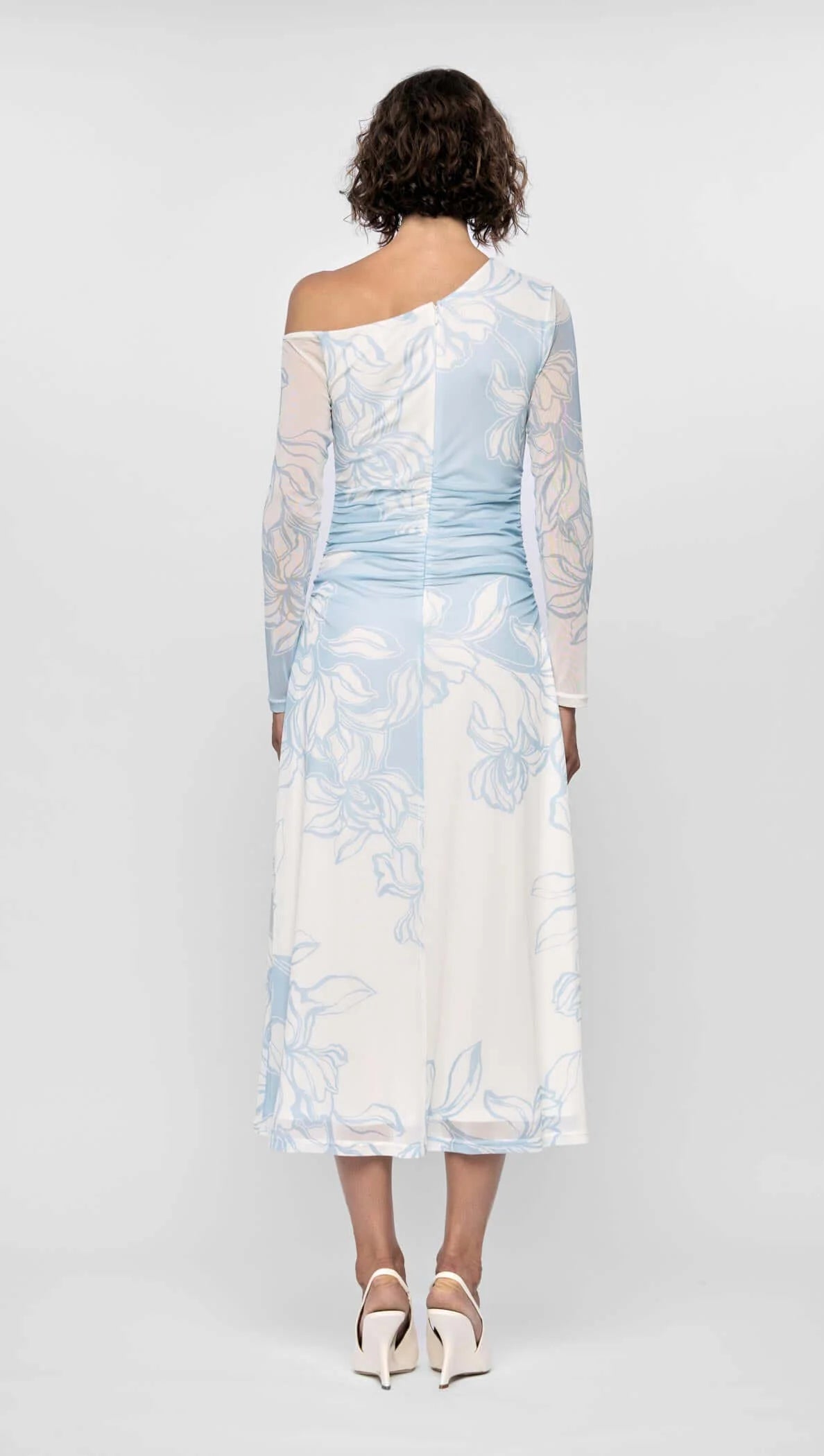 The Aurora Mesh Midi Dress captivates with its delicate sky blue floral mesh and elegant one-shoulder design. Featuring side ruching that flatters your silhouette and a softly flared hem, it balances ethereal charm with refined sophistication—ideal for making a graceful statement at any special occasion.