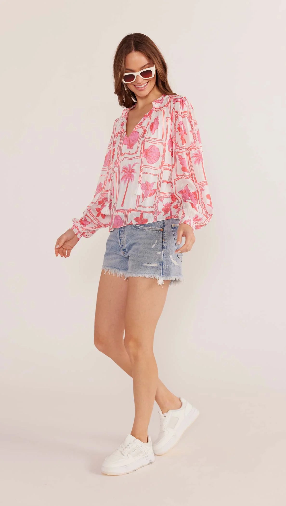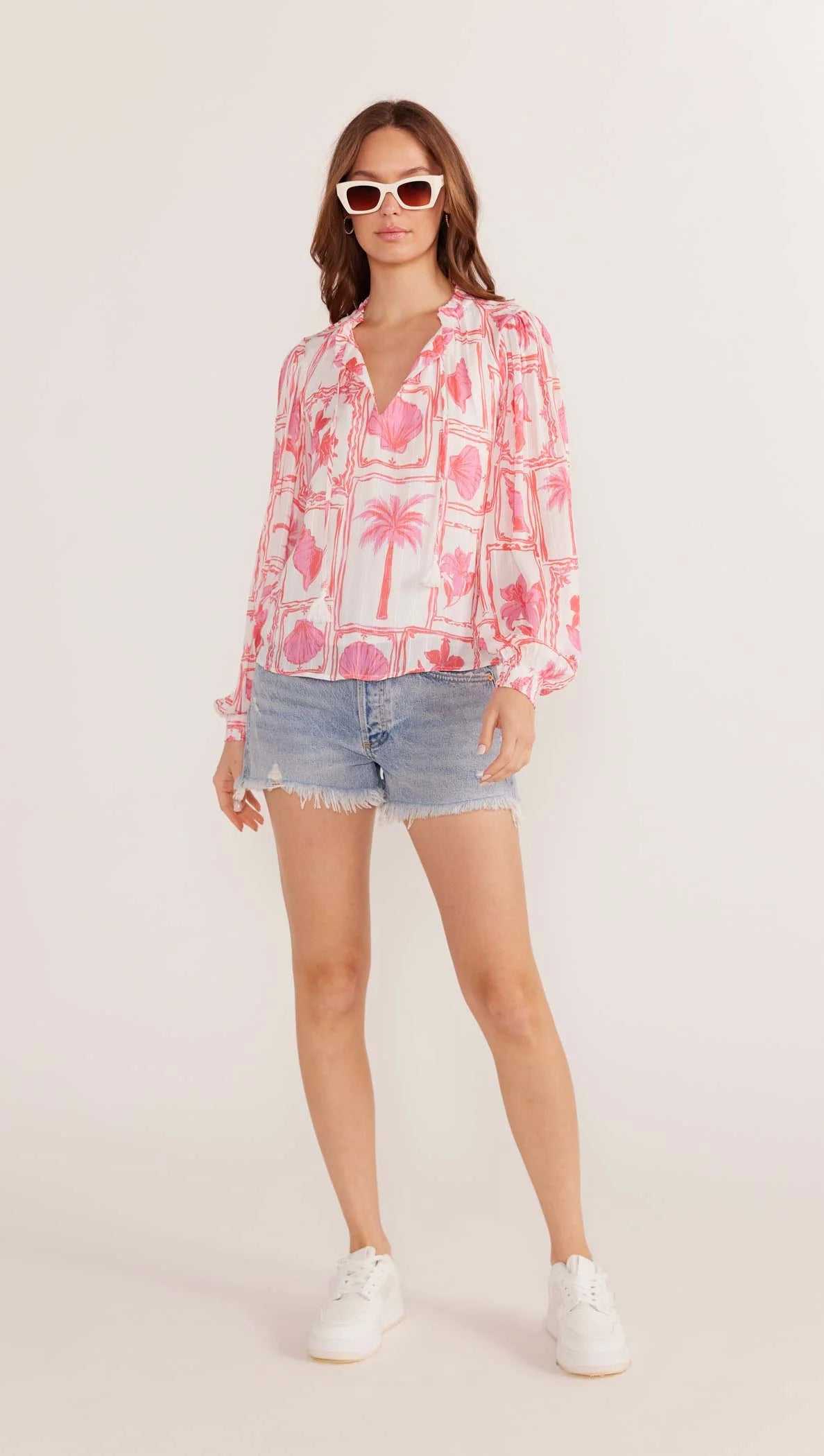 The Bria Long Sleeve Blouse is an instant winner. For those girlies with little time to spend getting ready but still want to put in the effort to look fabulous. This top features a cute and feminine postcard print exclusive to MINKPINK that will effortlessly compliment all your looks this season. Style with your favourite denim or linen bottoms, add in some statement earrings and cute bag to complete the look.