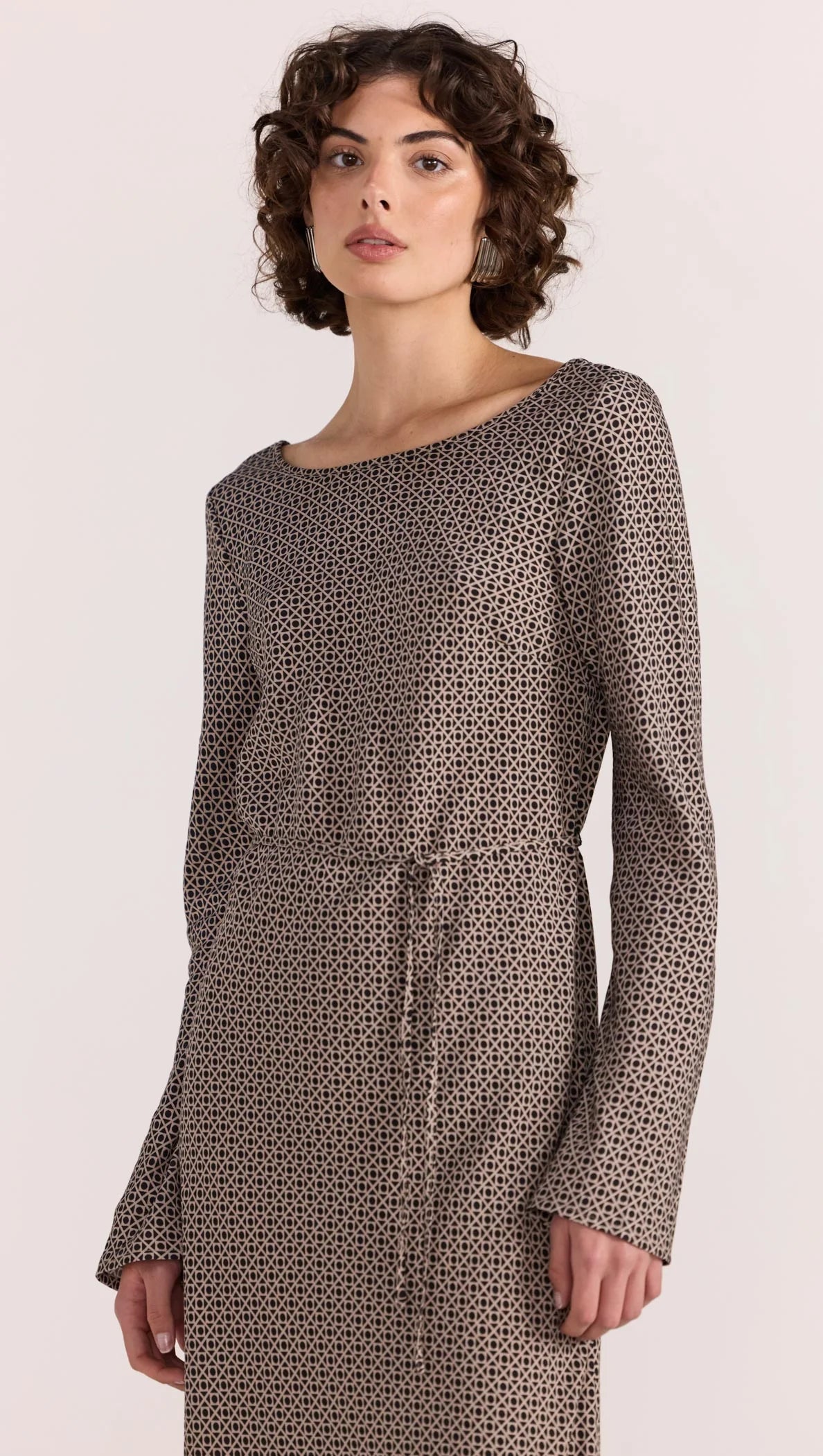 The Calla Bias Midi Dress features a drapey silhouette, and a muted geometric pattern. This print is exclusive to Staple the Label. Style with neutral mules or a knee high boot to complete the look.