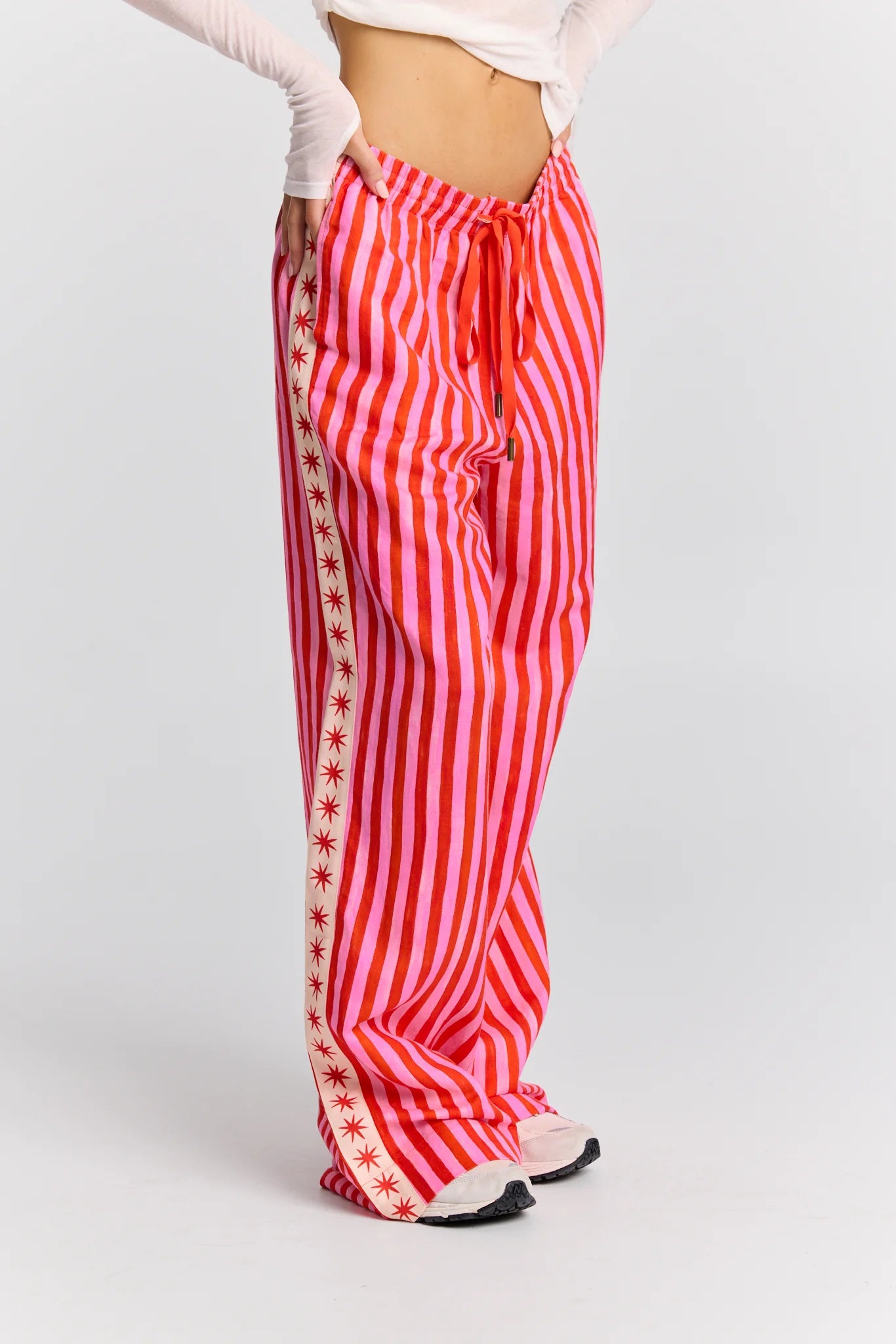 Effortless and bold, our Straight Leg Linen Pant in the pink and red stripe is designed to turn heads. Crafted from breathable linen/viscose blend for all-day comfort and minimal creasing, this relaxed silhouette features a full-length leg, elasticated waistband, and a tonal red drawcord for a personalised fit. A star side trim adds a signature Maku touch.