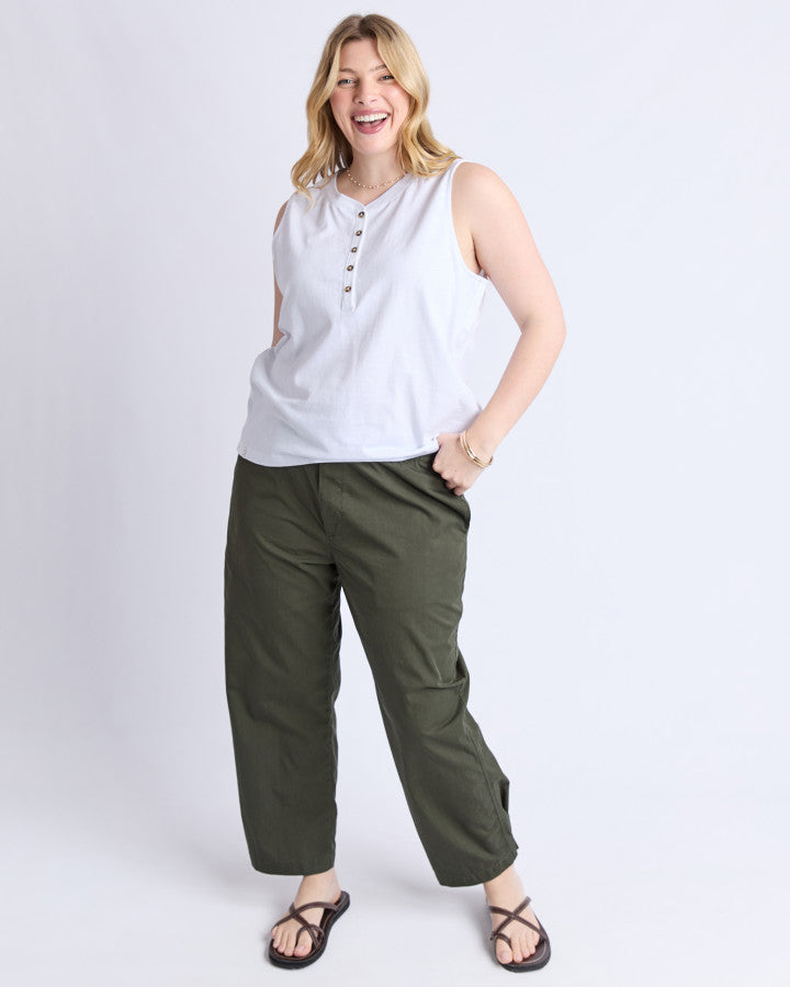 The Elysian Tank features a sleek button placket on the front for adjustable styling and added detail. Woven tape along the side seams enhances the tank's structure, creating a polished look while maintaining comfort. This versatile piece effortlessly elevates casual and layered outfits alike.