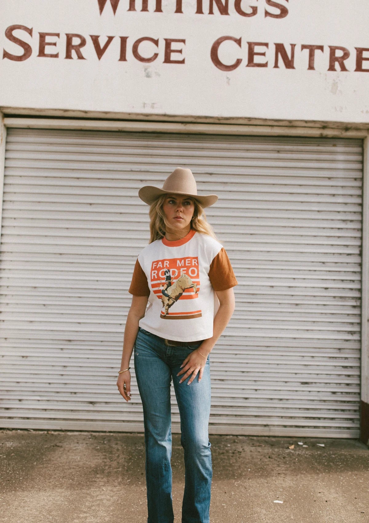 The FM Rodeo Short Cut Crew is a salute to rodeo bravado and dusty rebellion. Cut from heavyweight 230gsm cotton, it’s built to feel solid and lived‑in. The crisp‑white body is framed by burnt‑orange contrast sleeves and orange neck ribbing — a colourway reminiscent of arena dust and long Western roads. The bold chest graphic — inspired by vintage rodeo posters — hits like a bull out the gate: fast, loud, and unapologetically Western.