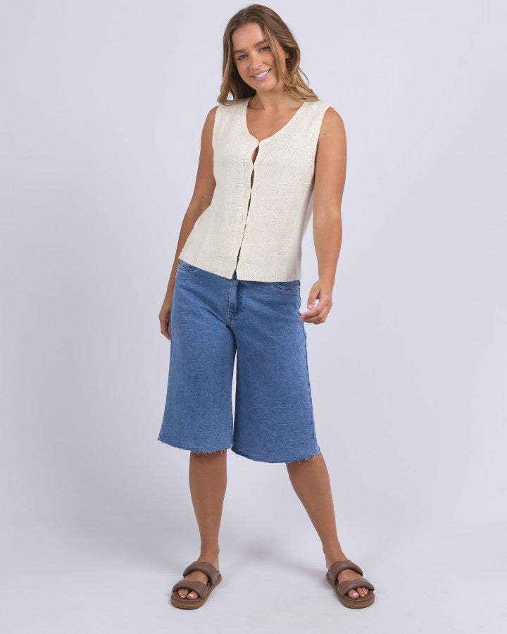 Dive into effortless style with the Golden Vest—soft, slouchy, and totally cool. Its flattering V neckline and hook-and-eye front make layering a breeze, while the easy drape adds laid-back charm. Whether worn on its own or layered over your favourite basics, this vest brings playful flair to any outfit.