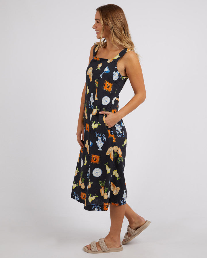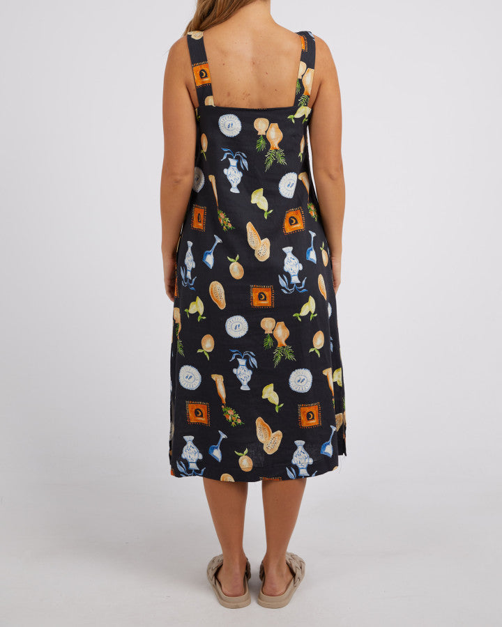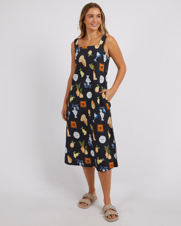 If you can't get to the Mediterranean bring the Med to you! Foxwoods sublime print of the season channels a stunning Italian Summer aesthetic on a classic and always in style black linen base. This flattering midi length dress features straps that cover your bra, pockets and is made from a fresh and lightweight linen cotton blend, so the ideal piece for your warm weather wardrobe.