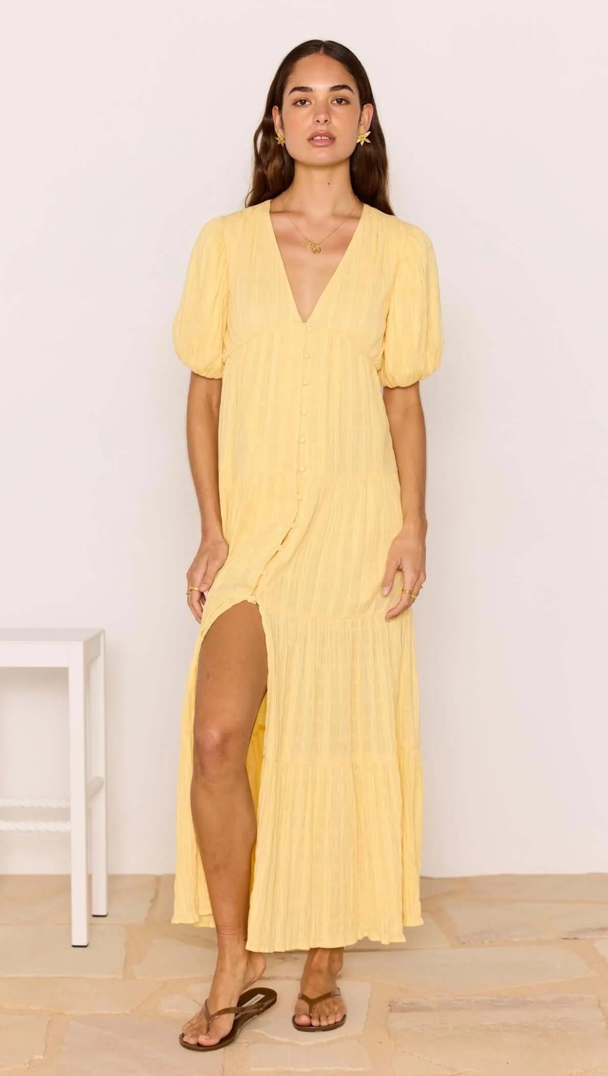 A sunshine-ready staple, the Leon Relaxed Yellow Cotton Tiered Maxi Dress blends ease and elegance in one floaty silhouette. Crafted from soft 100% cotton with a subtle crinkle texture, it features a tiered skirt, button-down front, and a flattering V-neckline. Perfect for weekend markets, long lunches, or balmy beach evenings.