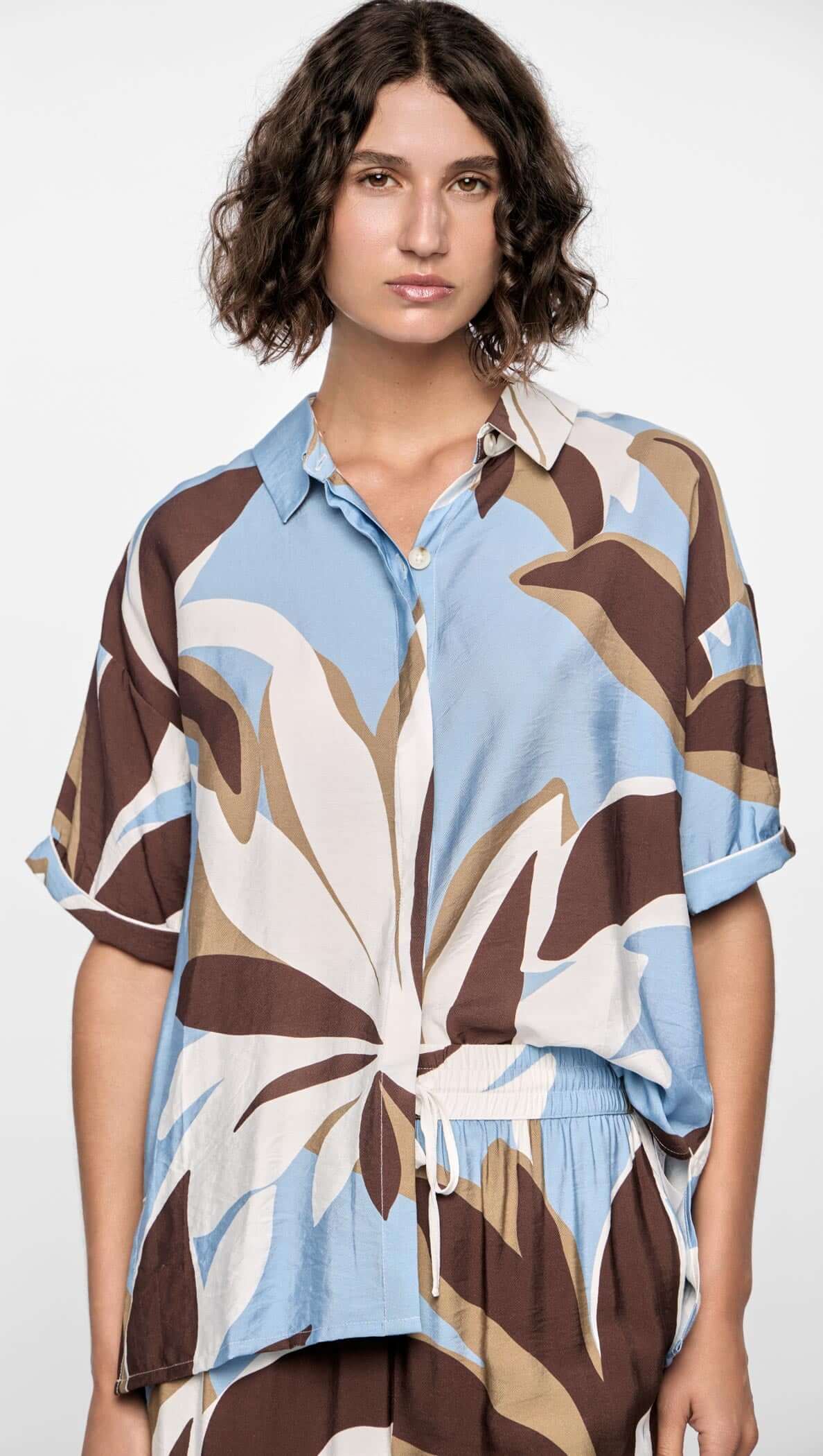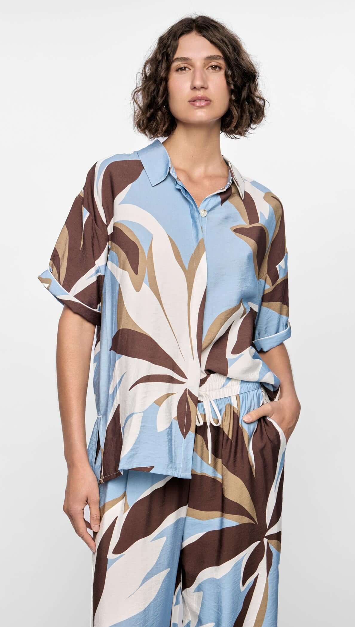 The Maeve Resort Shirt elevates your everyday wardrobe with its sophisticated blend of bold abstract patterns in chocolate, blue, and cream. Crafted from lightweight, breathable fabric, it offers effortless comfort and style. Wear it open over a tank or tied at the waist to create a relaxed yet refined summer look, perfectly paired with the matching Maeve Pants for a complete ensemble.