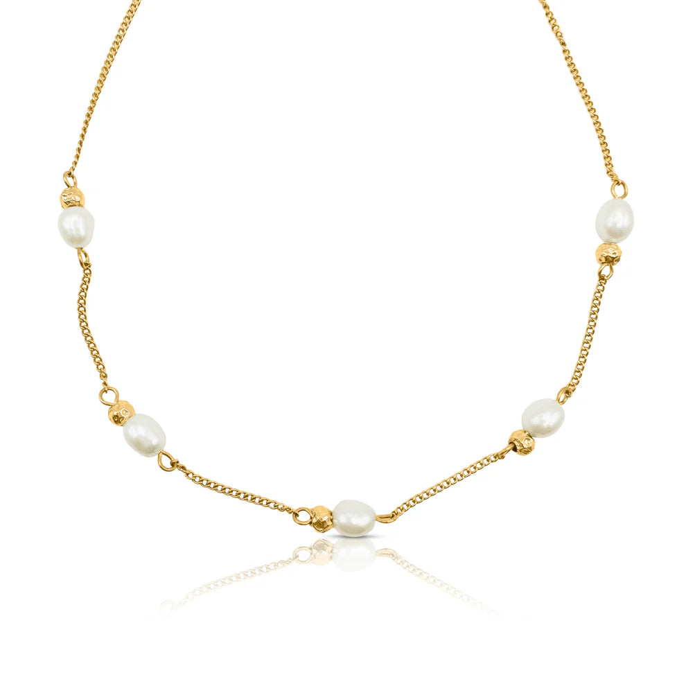The Off Court Pearl Necklace features a fine chain dotted with five freshwater pearls and hammered golden balls ~ delicate, lightweight and full of soft texture.