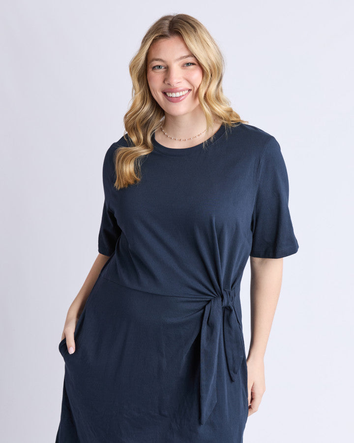 The Picnic Dress features a relaxed fit and midi length for comfortable, easy wear throughout the day. Its tie waist allows you to adjust the fit to your preference, enhancing your silhouette while maintaining a flattering and effortless style. This dress combines comfort and confidence for a versatile addition to your wardrobe.