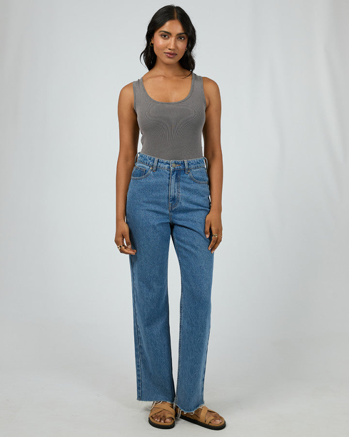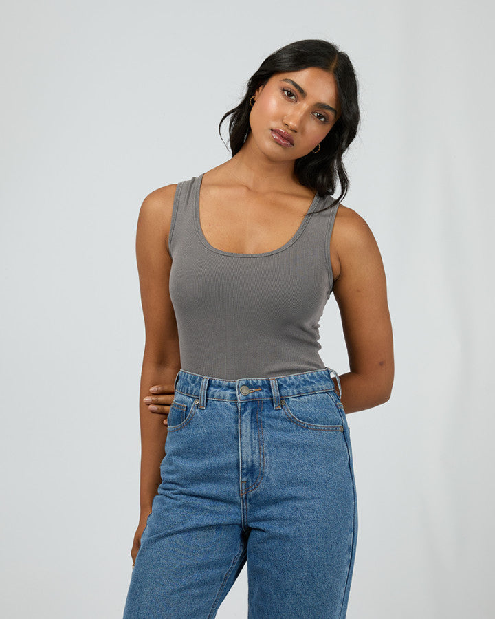 The Washed Rib Scoop Neck Tank features a flattering scoop neckline and a soft washed rib fabric in charcoal, offering both comfort and style. Perfect for layering or wearing on its own, it provides a sleek fit that moves with you throughout the day.